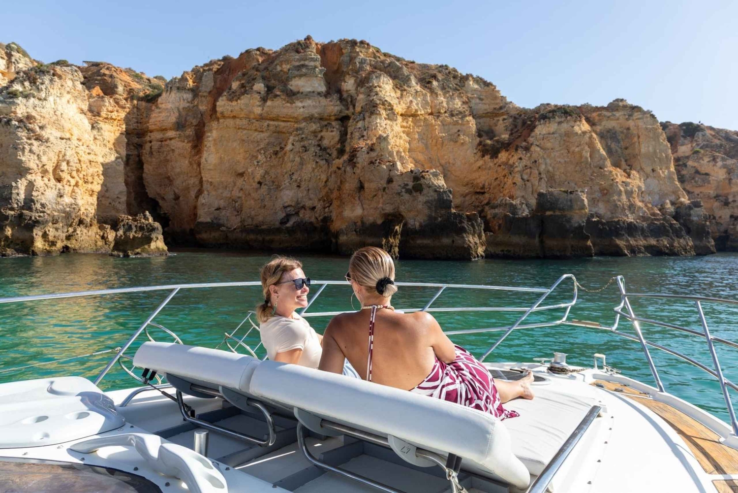 Gå ombord på en luksuriøs Cranchi 47-båd, og sejl på en privat tur til Ponta da Piedade. Mærk solen på din hud og havbrisen i dit hår, mens din erfarne kaptajn navigerer mellem de dramatiske gyldne klipper, hemmelige havgrotter og skjulte grotter, der gør denne kystlinje verdensberømt.