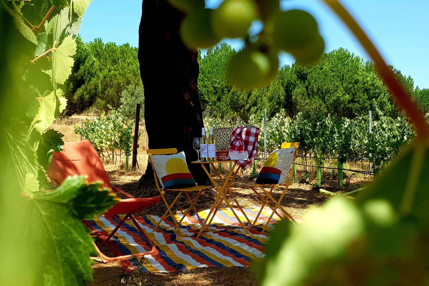 Det er den virkelighed, vi inviterer dig til at lære at kende. Du vil deltage i en guidet, kommenteret og dokumenteret rundvisning på ejendommen, hvor du får en historisk baggrund for ejendommen og regionen og en detaljeret forklaring på den vinfremstillingsproces, der bruges til at producere Herdade Canal Caveira-vine. Efter rundvisningen er det tid til at samle din kurv med regionale produkter og gå på opdagelse efter det perfekte sted midt i vinmarken, hvor du kan brede dit håndklæde ud og nyde en typisk Alentejo-picnic med bl.a. oste, pølser, olivenolie, brød, frugt og småkager. En flaske Herdade Canal Caveira-vin vil ledsage måltidet.