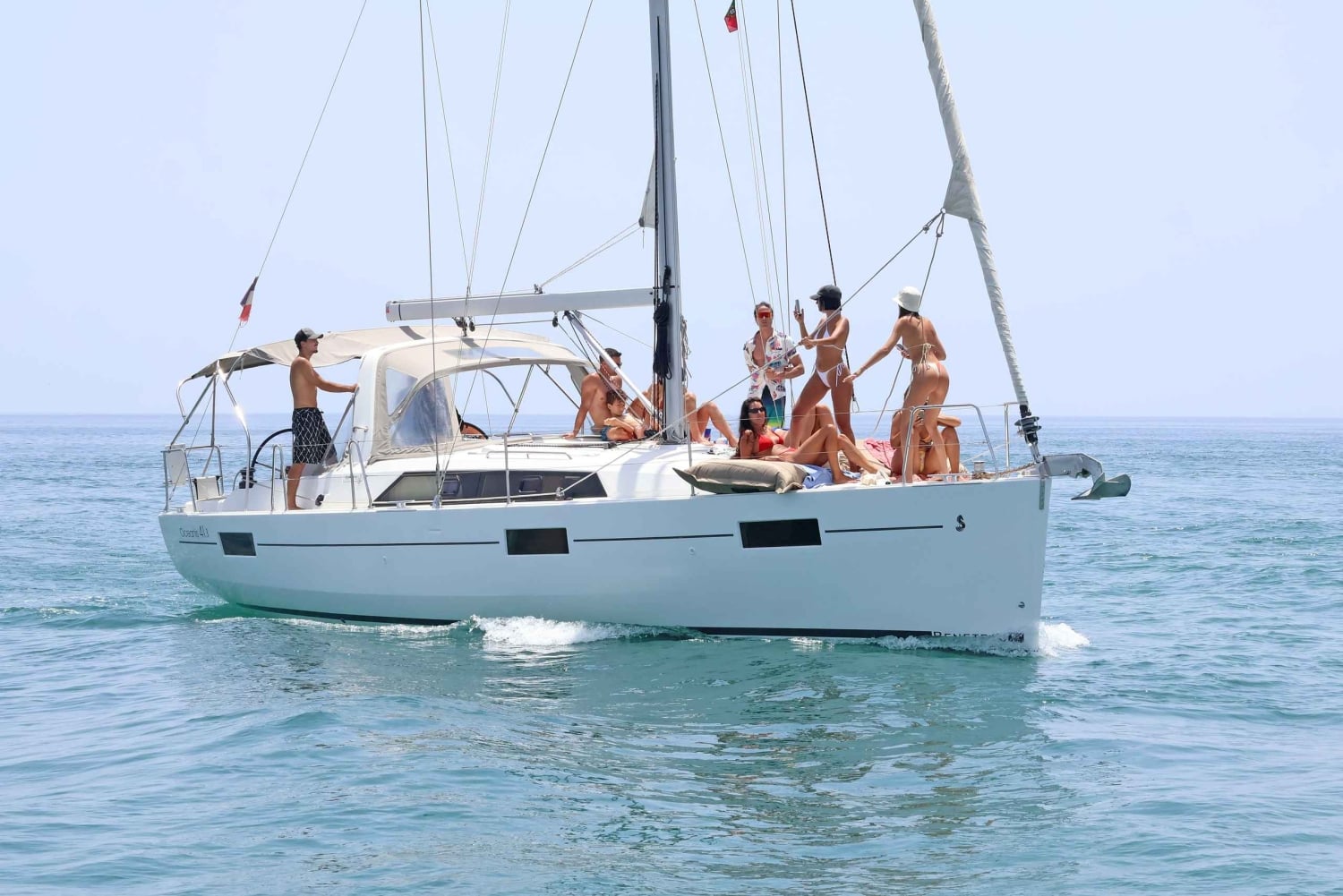 Stig om bord på en privat sejltur fra Portimão Marina om bord på en Beneteau Oceanis 41.1. Vælg mellem to lige så fascinerende ruter: Benagil eller Lagos.