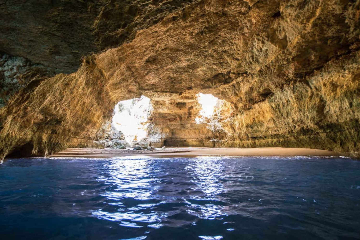 Genieße eine erfrischende Fahrt mit dem Schnellboot und erkunde die berühmten Benagil Sea Caves bei einer geführten Tour. Bewundere die malerischen Aussichten und beobachte die Delfine, die sich im Wasser tummeln.