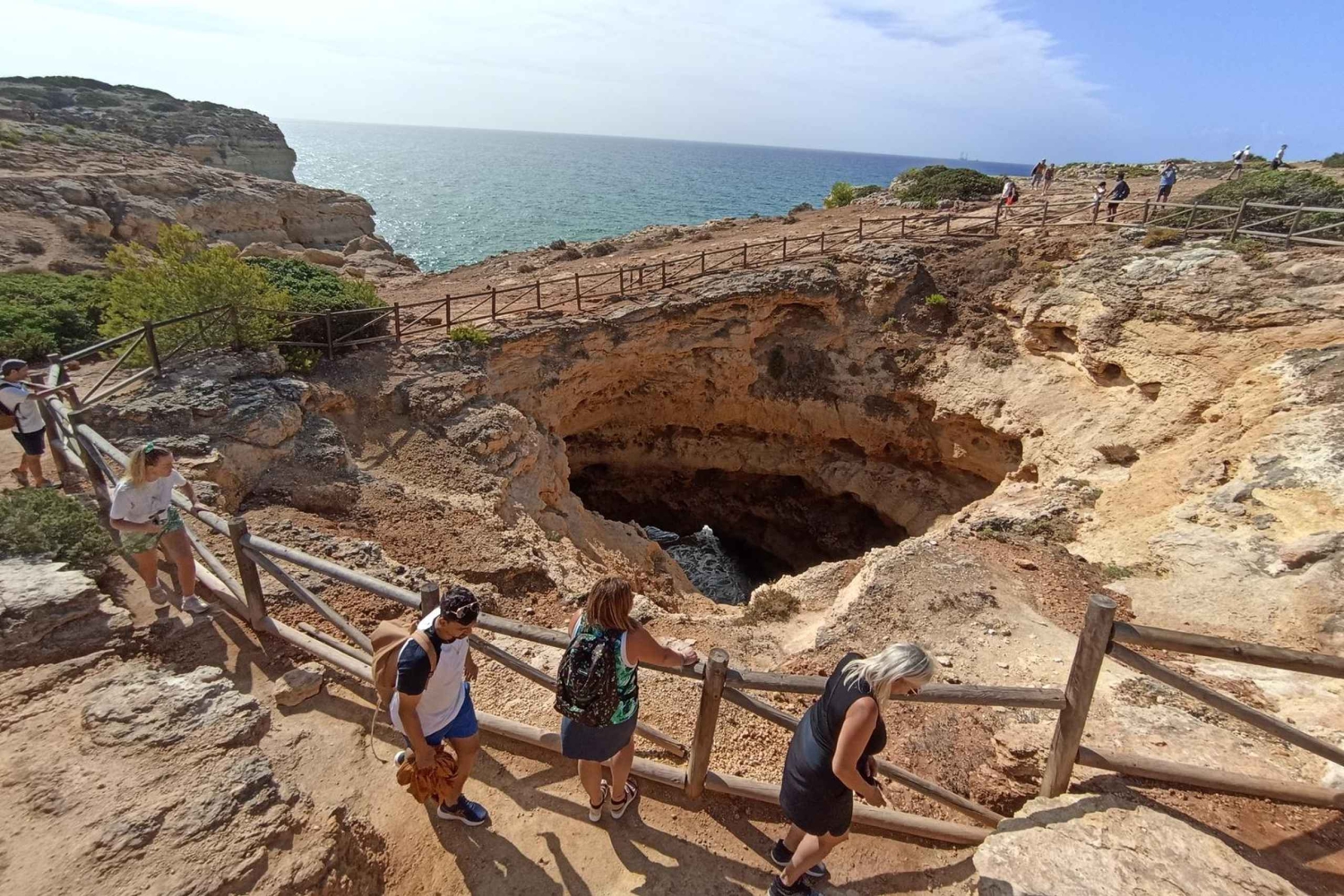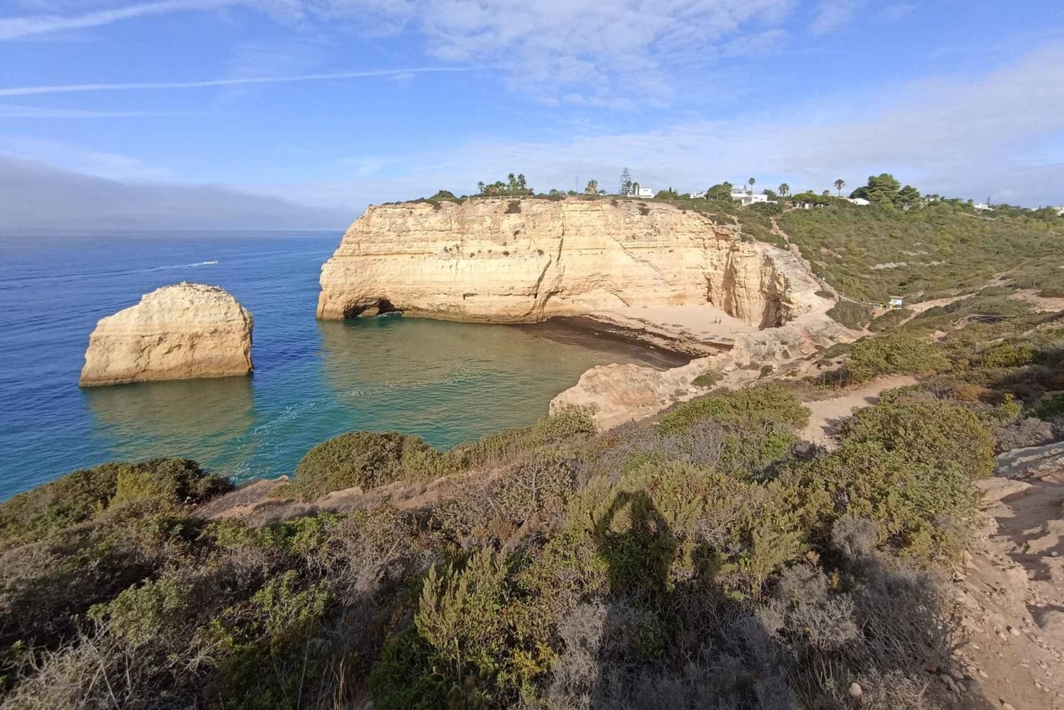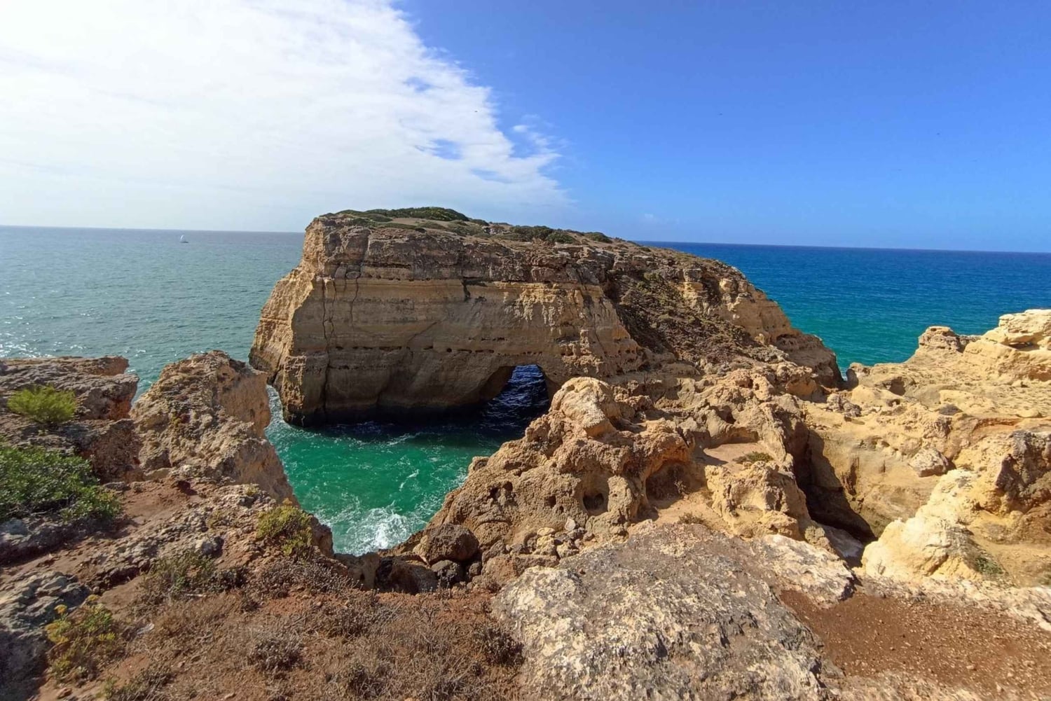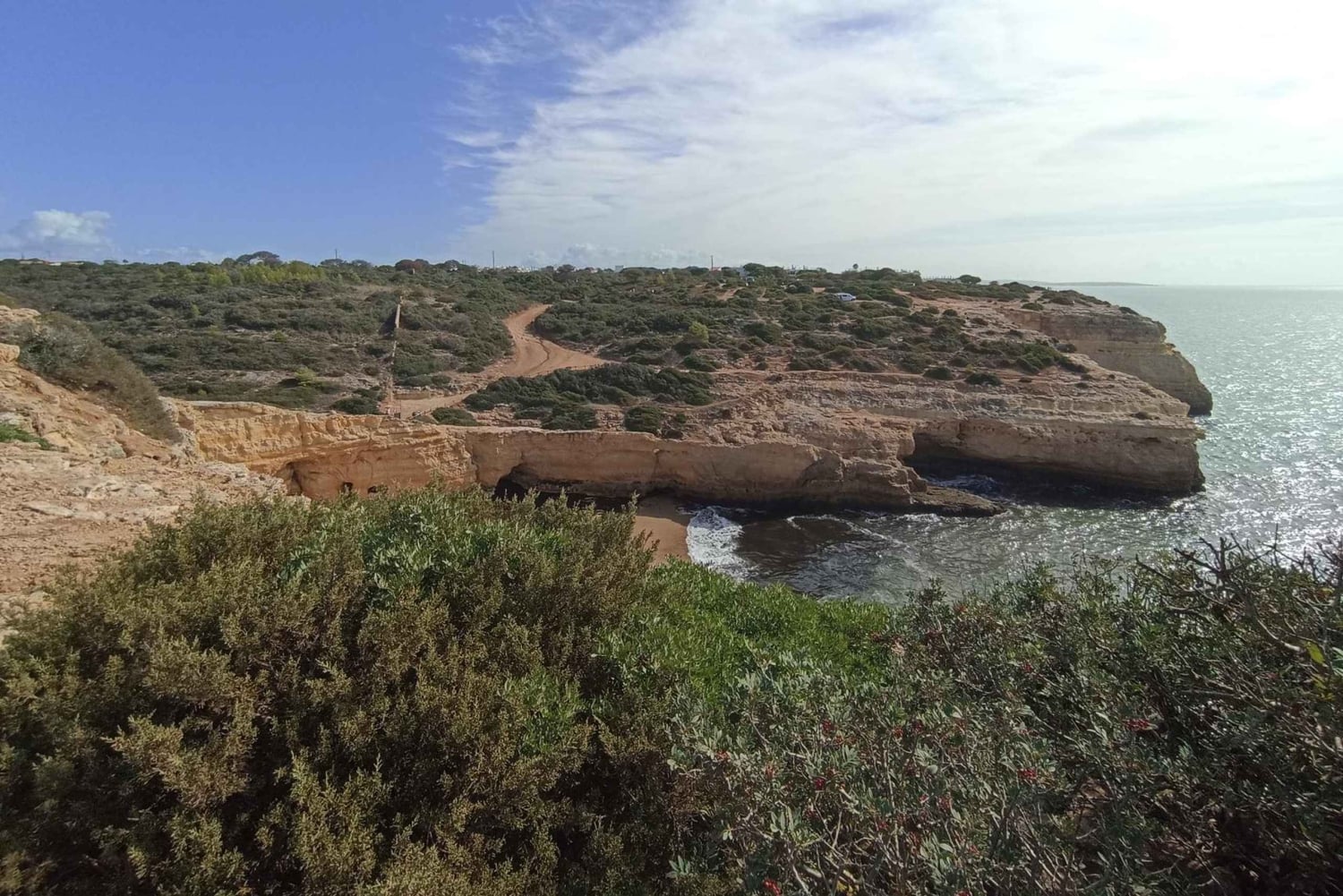 Entdecke eine atemberaubende Wanderstrecke mit einer Landschaft aus Klippen und Dolinen in der Region Lagoa. Dies ist eine beliebte Küstenwanderstrecke in der Algarve und erstreckt sich entlang der atemberaubenden Klippen zwischen den Stränden Praia da Marinha und Praia Vale Centeanes. Sie bietet Wanderern die Möglichkeit, einige der atemberaubendsten und dramatischsten Küstenlandschaften Portugals zu erleben.