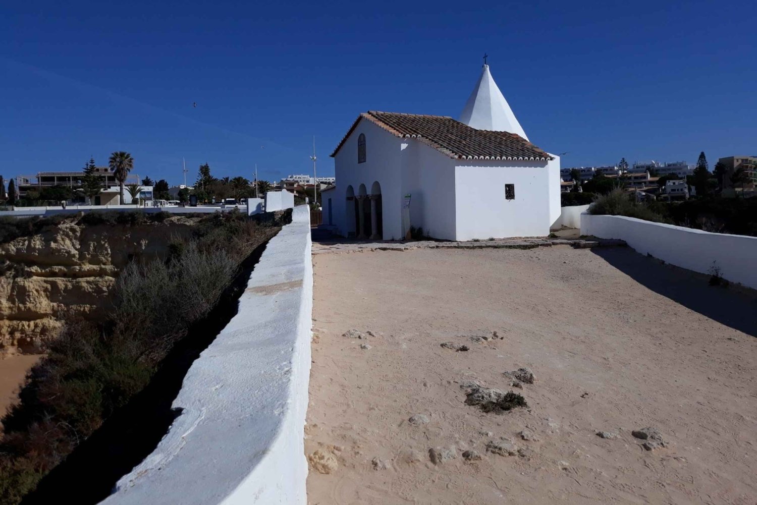 Du startest von deiner Unterkunft in Albufeira in Richtung Benagil und fährst durch das Dorf Armação de Pera auf dem Weg zu Our Lady of the Rock. Bewundere die spektakuläre Aussicht auf die Umgebung von der Kapelle auf der Landzunge des Strandes.