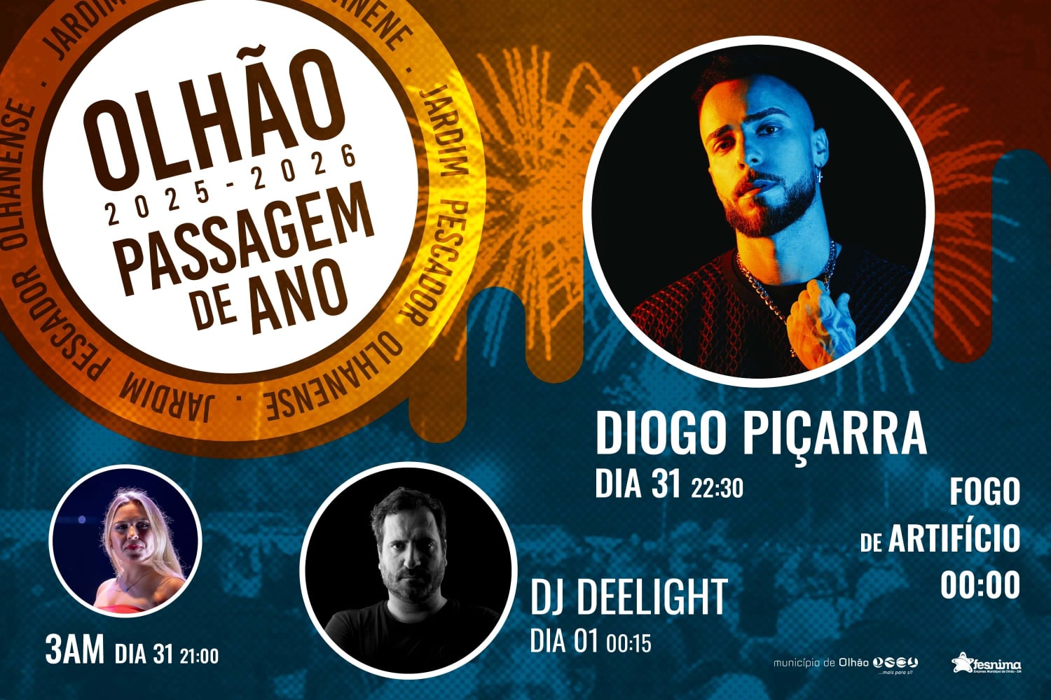 In Olhão erwarten Sie weitere kostenlose Straßenparty-Unterhaltung, um 2026 willkommen zu heißen. Diogo Piçarra ist mit Live-Musik auf der Bühne, um Sie bis Mitternacht zu begleiten und das neue Jahr mit Feuerwerk zu begrüßen. Dann legt DJ Deelight auf und begleitet Sie in die frühen Morgenstunden von 2026.