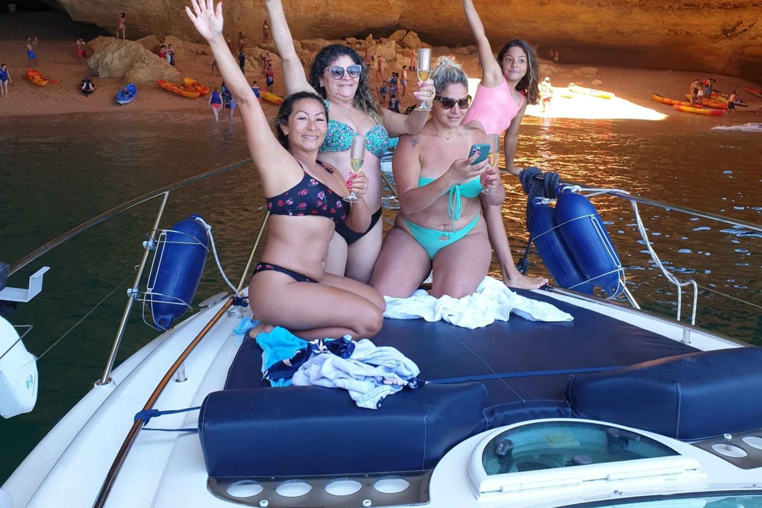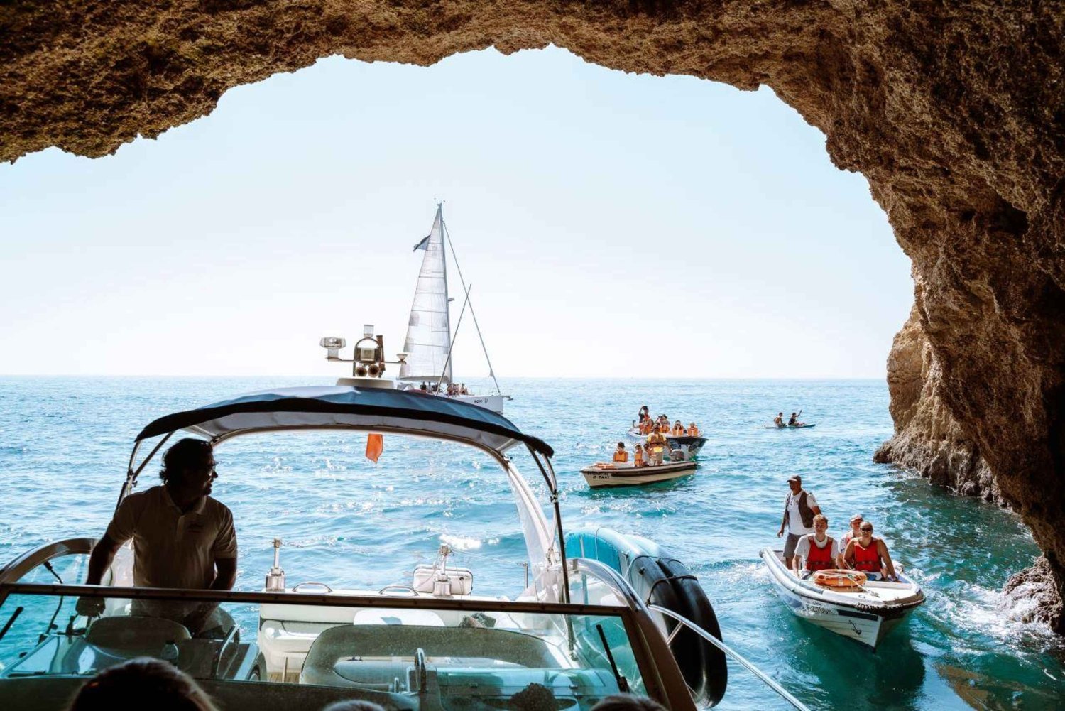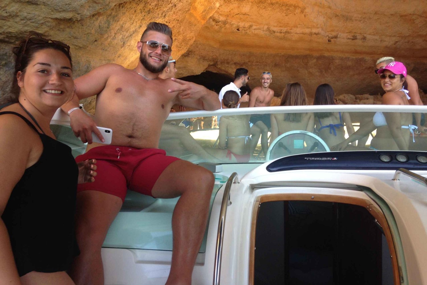 Dirígete al este hacia la Cueva de Benagil y descubre la hermosa costa por el camino. Toma tú mismo el timón mientras el barco coge velocidad hacia tu destino. Detente en lugares interesantes para practicar snorkel, bebe champán mientras las fantásticas vistas de la costa de Portugal se abren a tu vista. Esta excursión de tres horas y media tiene un valor excepcional.