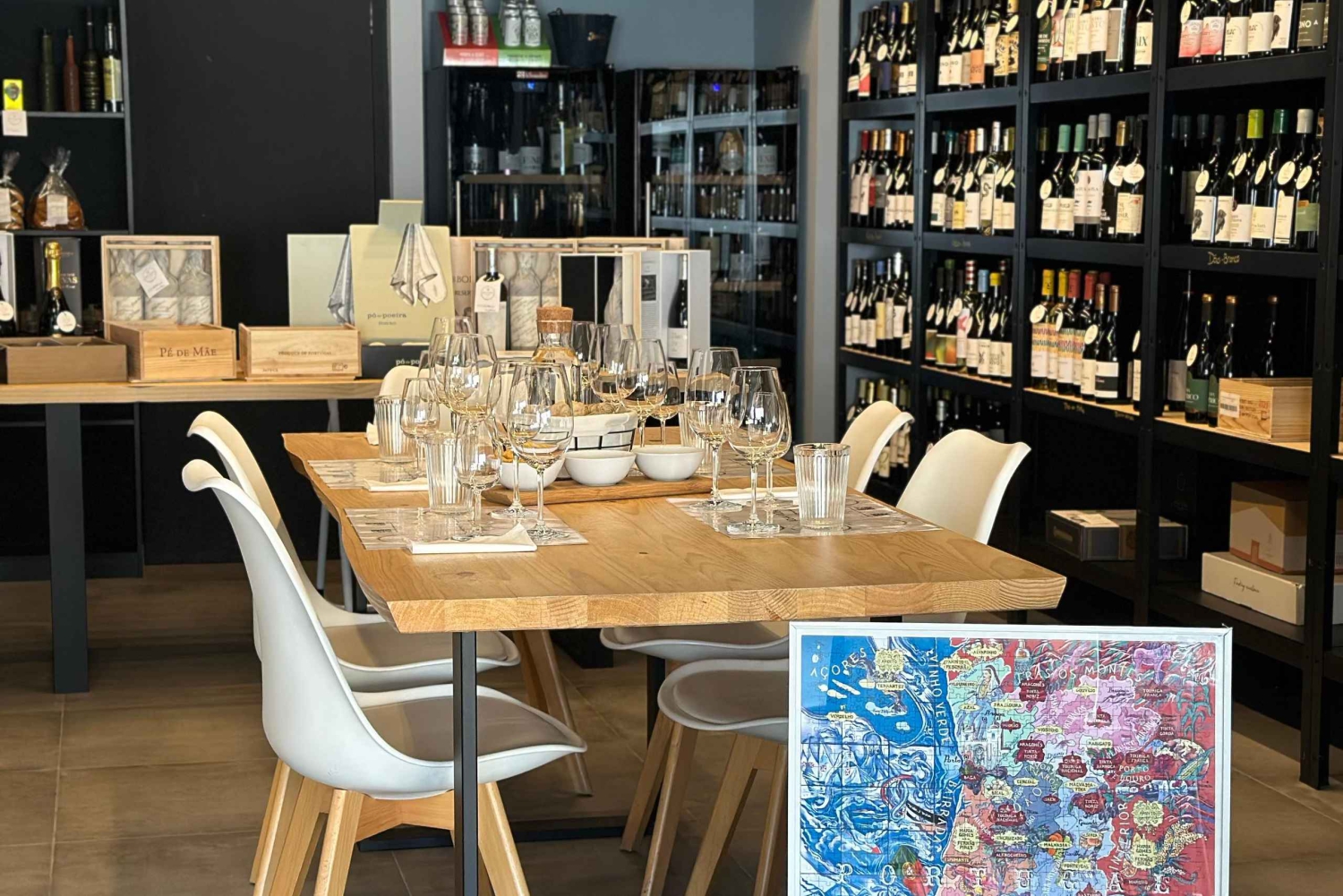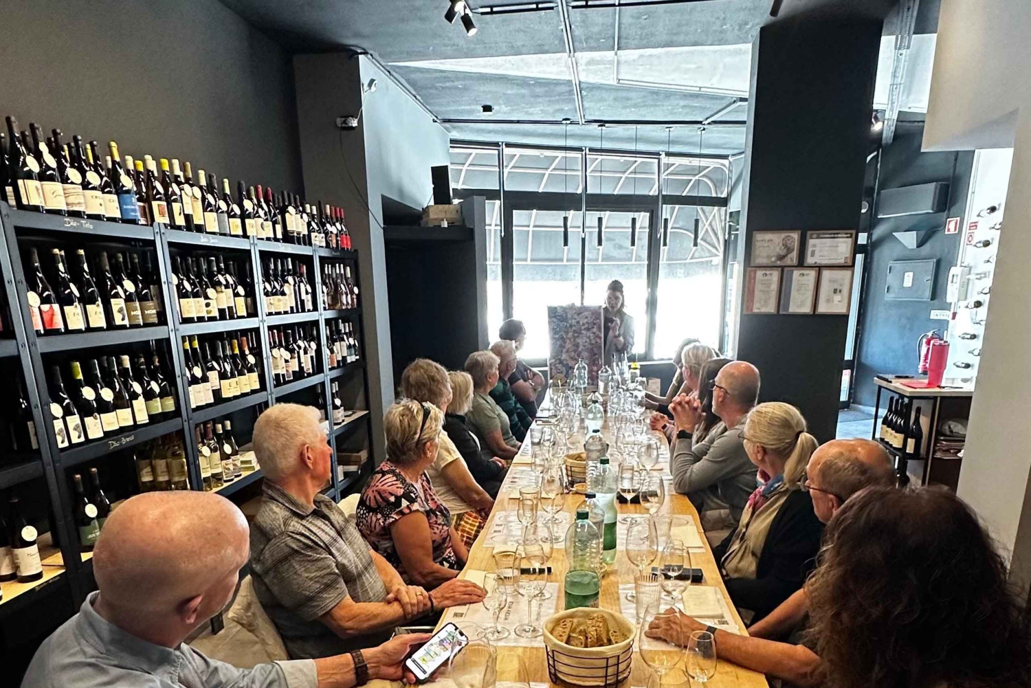 La cata tiene lugar en una tienda de vinos en funcionamiento; aunque solo se realiza una sesión guiada por franja horaria, es posible que haya otros clientes disfrutando de una copa de vino en mesas separadas. Este ambiente animado y auténtico refleja el verdadero espíritu de la cultura vinícola local.