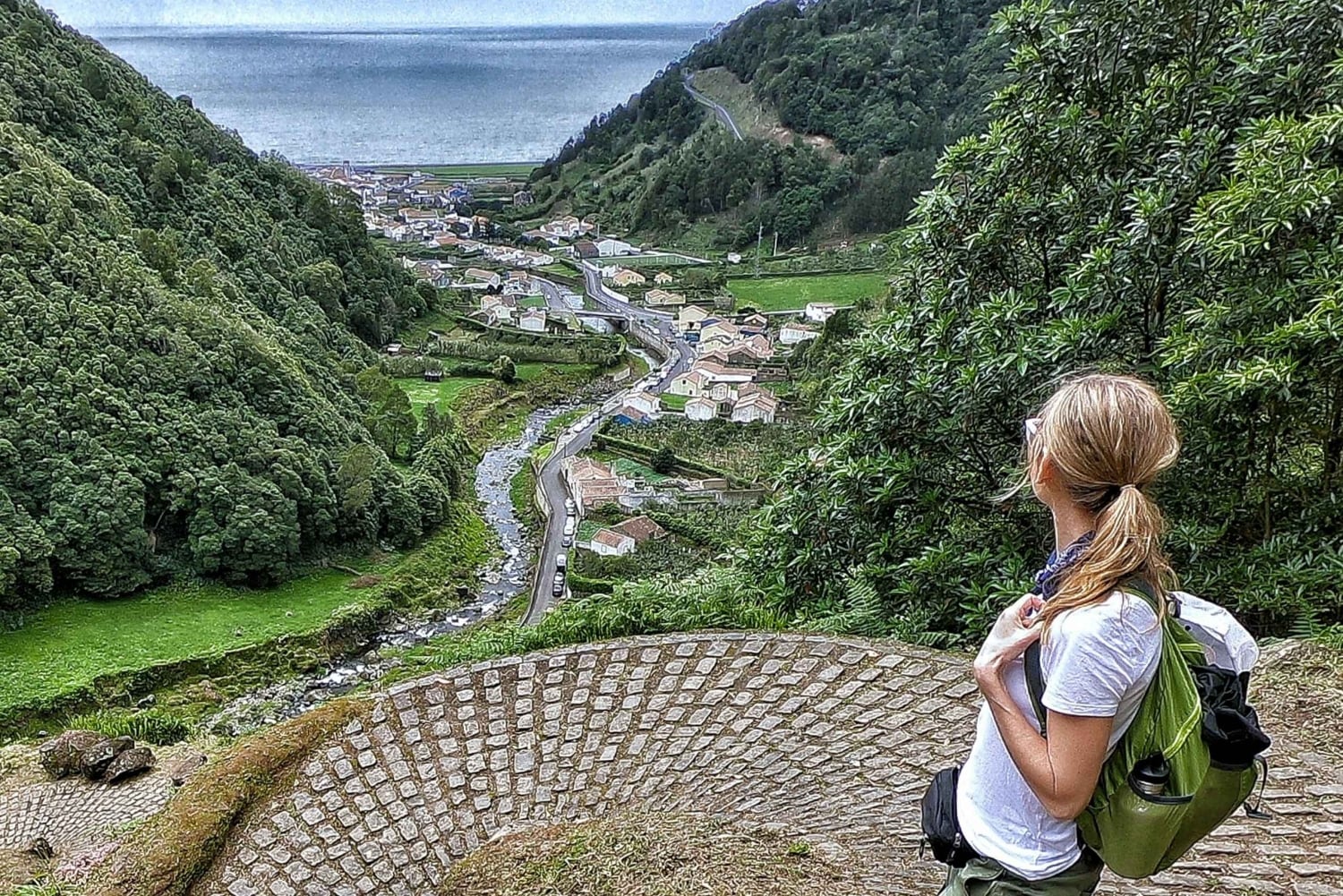 On the return, the trail takes us to the village of Sanguinho, an old settlement that was abandoned several decades ago and is currently being restored. This route offers panoramic views of the valley and the ocean, completing the hike with a connection to the region’s past.