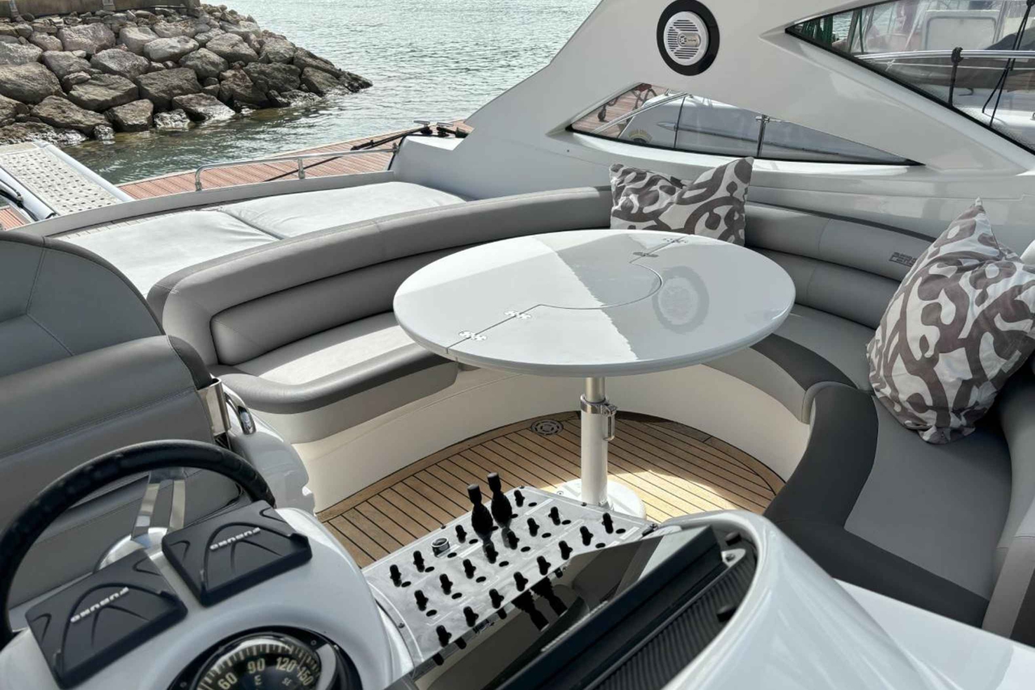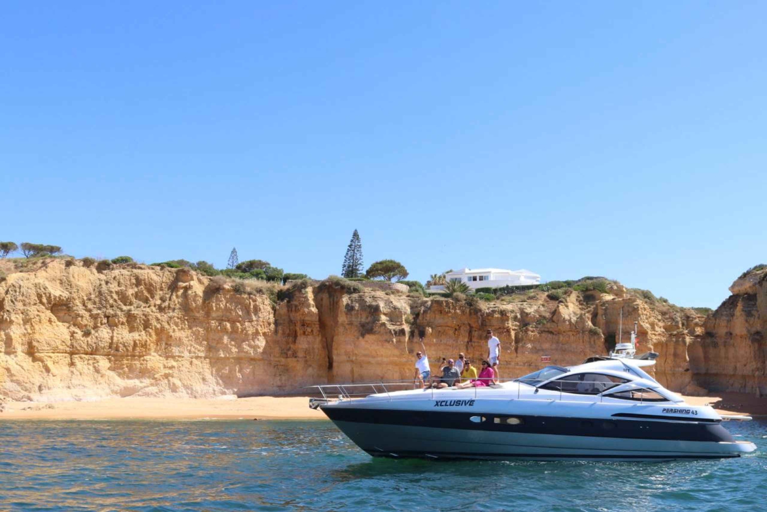 Discover a world of luxury and adventure aboard Xclusive. Toast with champagne and enjoy the wonderful fruit, cheese and cold cuts plates, while sailing along the cost of Algarve. Sail through isolated bays and be enchanted by the panoramic views of the coast. Relax under the Algarve sun while enjoying a classy service provided by our team, always ready to ensure that every moment is perfect. Immerse yourself in the tranquility of the sea, explore secret corners and enjoy the sophistication and comfort that only Xclusive can offer. Come and live an unforgettable experience, where every detail is thought of to provide you with the best in luxury and adventure.