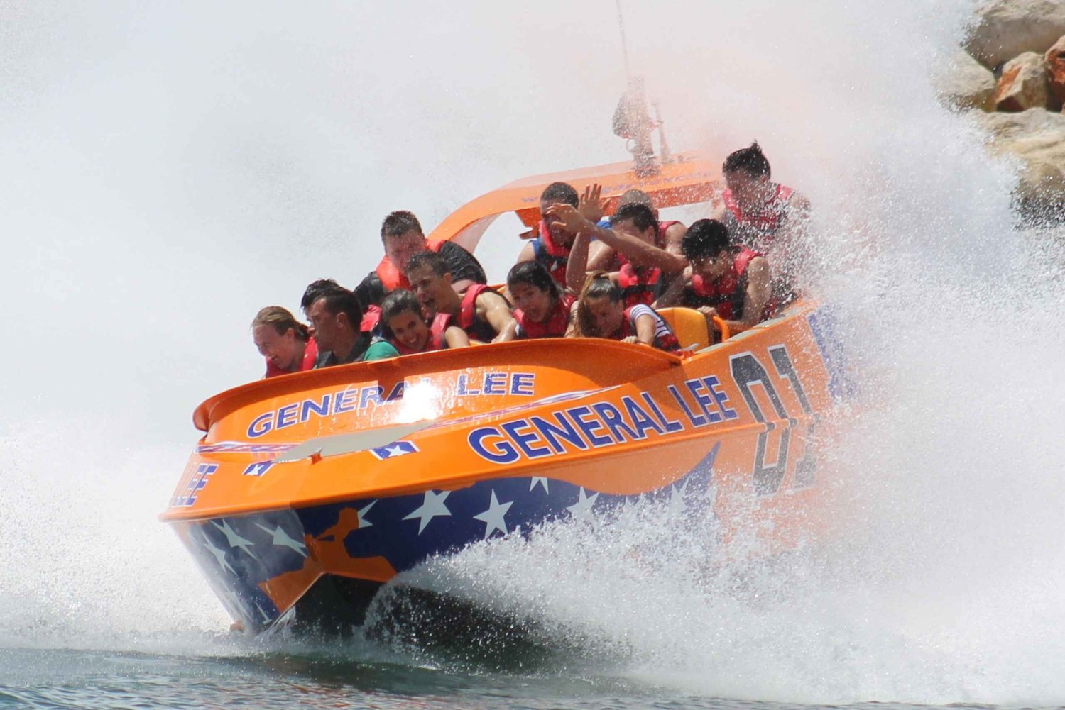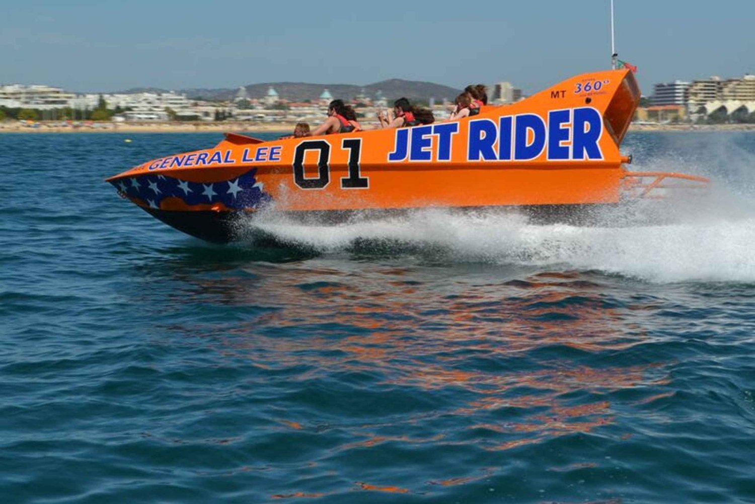 Koe huippunopeuden ja 360 asteen pyörähdysten jännitys 30 minuutin jet boat -kokemuksessa Vilamourassa. Aja aaltojen päällä ammattitaitoisen kapteenin ohjauksessa.