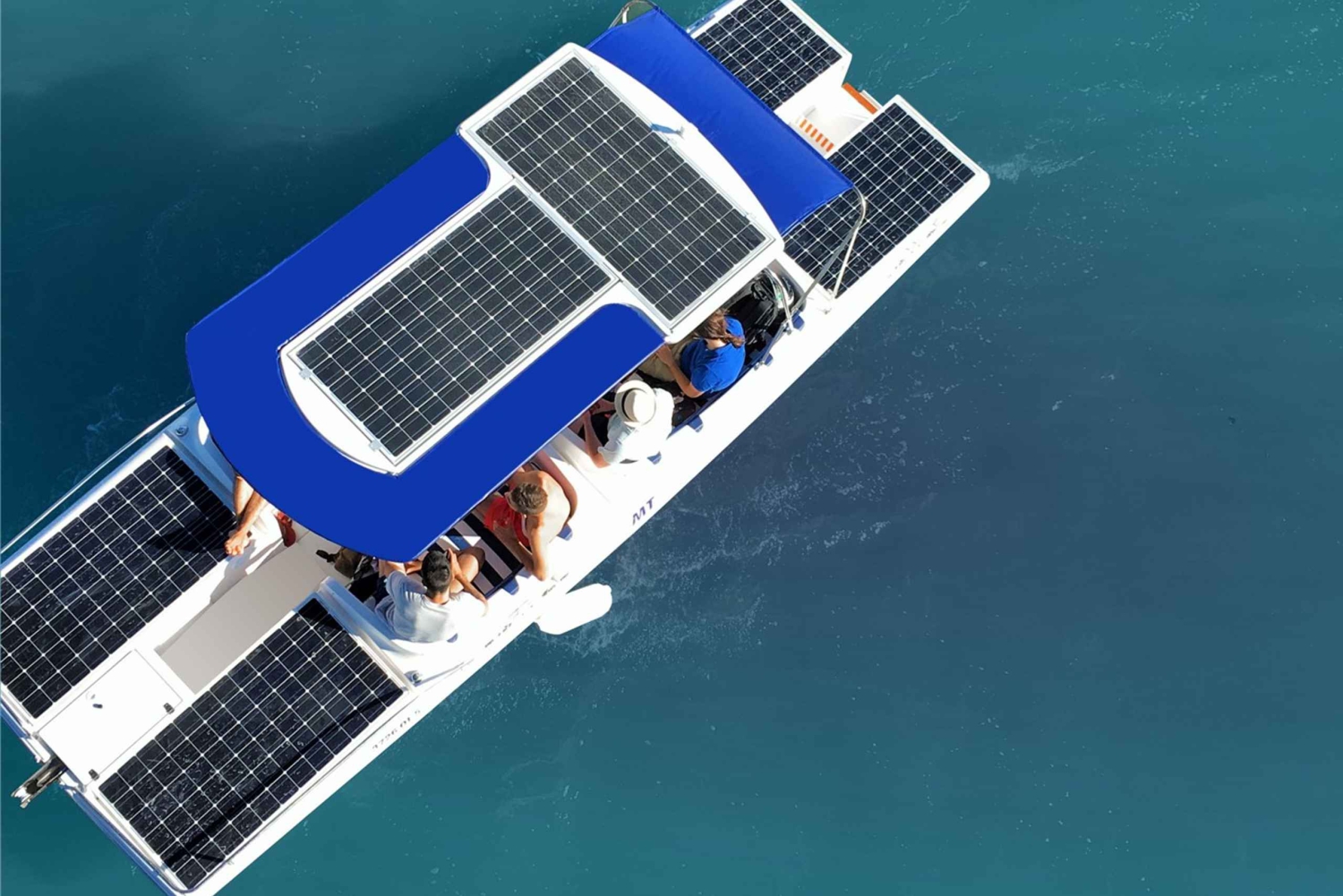 Ekologinen veneemme on hiljainen ja täydellinen niille, jotka etsivät rauhallista ja rentouttavaa venematkaa. Kuvittele itsesi asettumaan muhkeisiin, pehmustettuihin istuimiin, jotka ovat varjossa kuin VIP-asiakkaat rantajuhlissa, ja pöydät ovat valmiina juomia ja henkilökohtaisia aarteitasi varten.