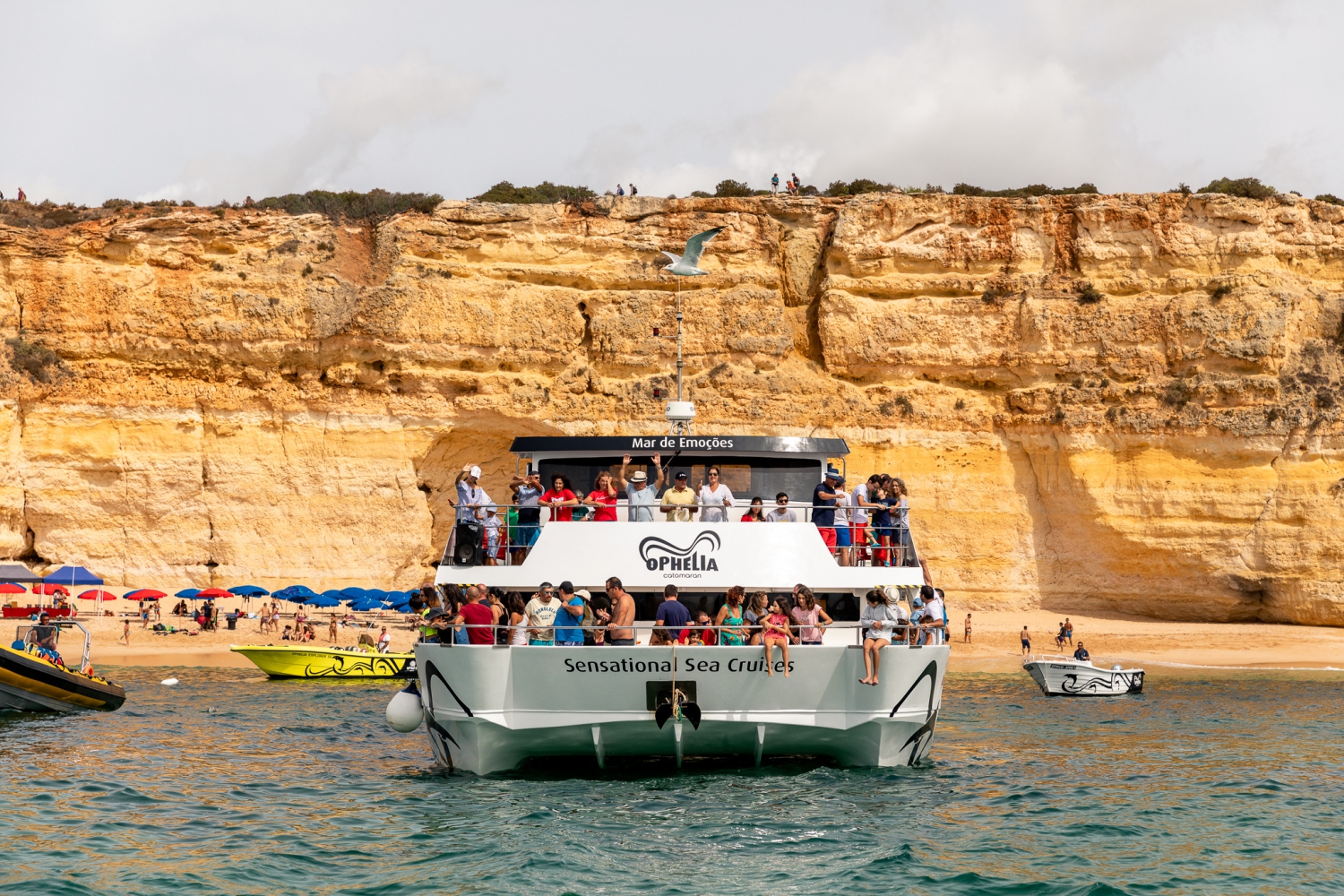 Explorez la côte de l'Algarve, y compris la grotte de Benagil avec les croisières en bateau Ophelia. Surveillez les dauphins sauvages, découvrez des plages secrètes et profitez des fêtes en bateau en été à bord de ce catamaran moderne et confortable.