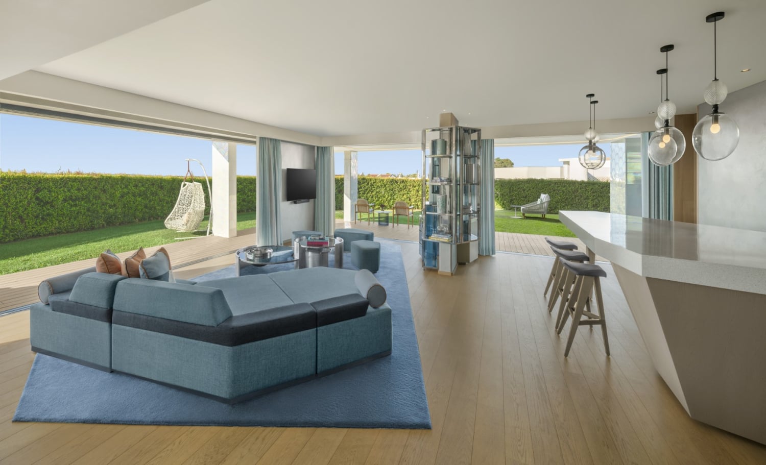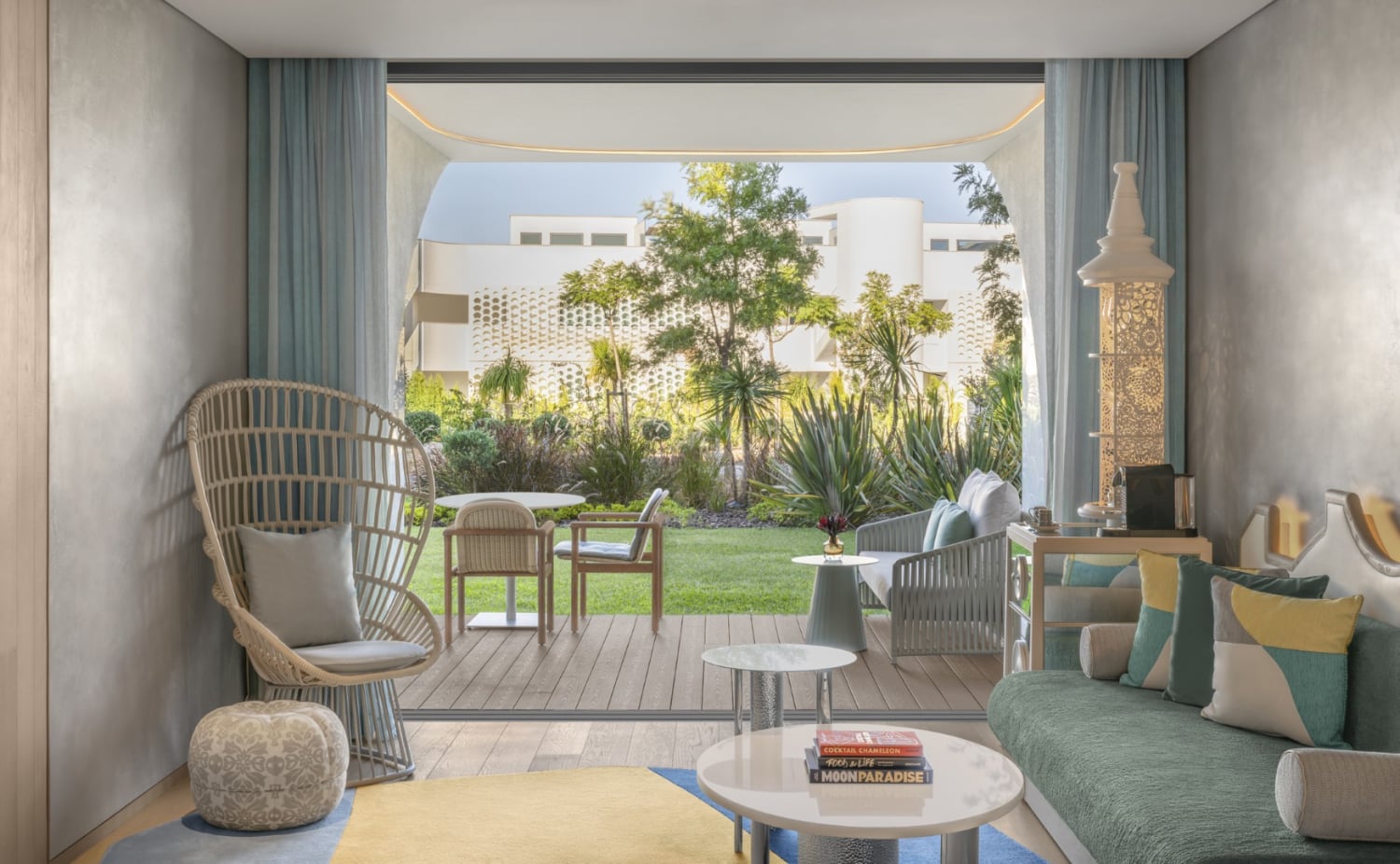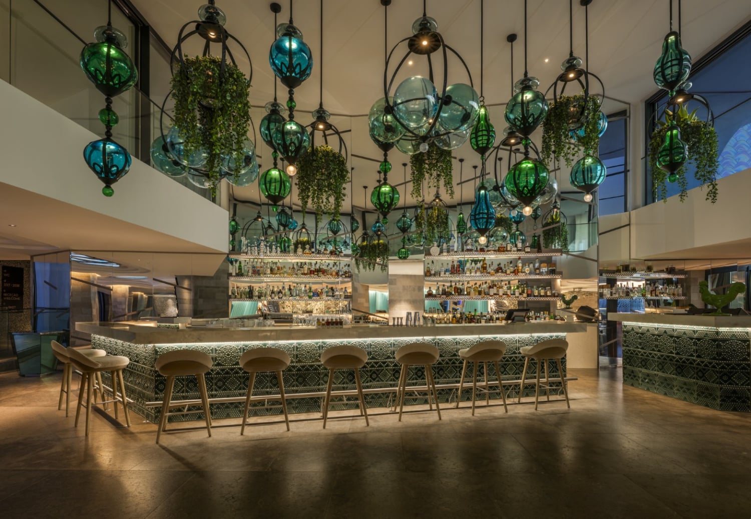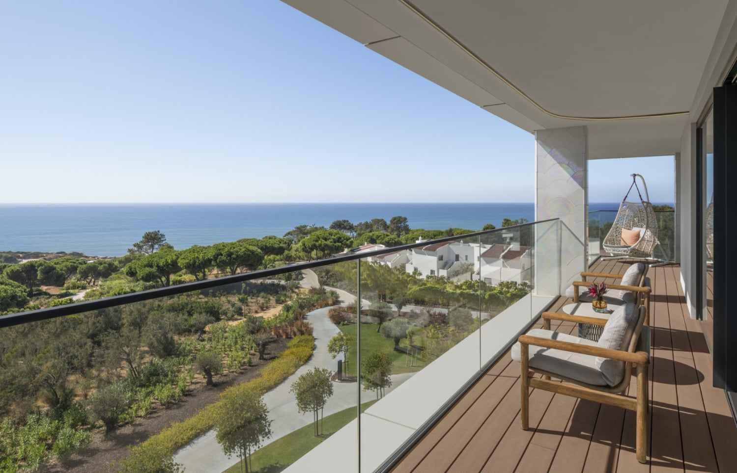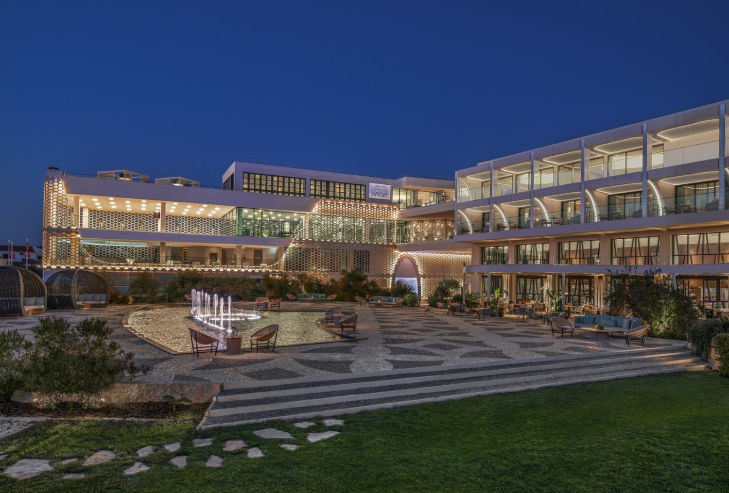dompelbad. Moderne ontwerpen met lokale invloeden vermengen zich tot iets wat onmiskenbaar Portugees en volledig W is, waarbij elk detail nog een laag toevoegt aan de zintuiglijke ervaring, zoals de parelmoeren tegels op de balkons, die de veranderende tinten van de zon weerspiegelen naarmate de dag overgaat in de schemering.