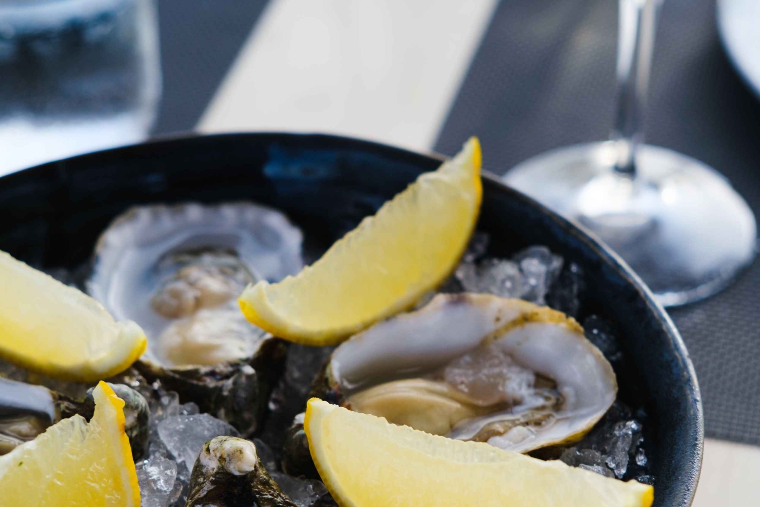 - Geniet van verse oesters, kokkel rissoles en tonijn muxama aan een tafel in de jachthaven.