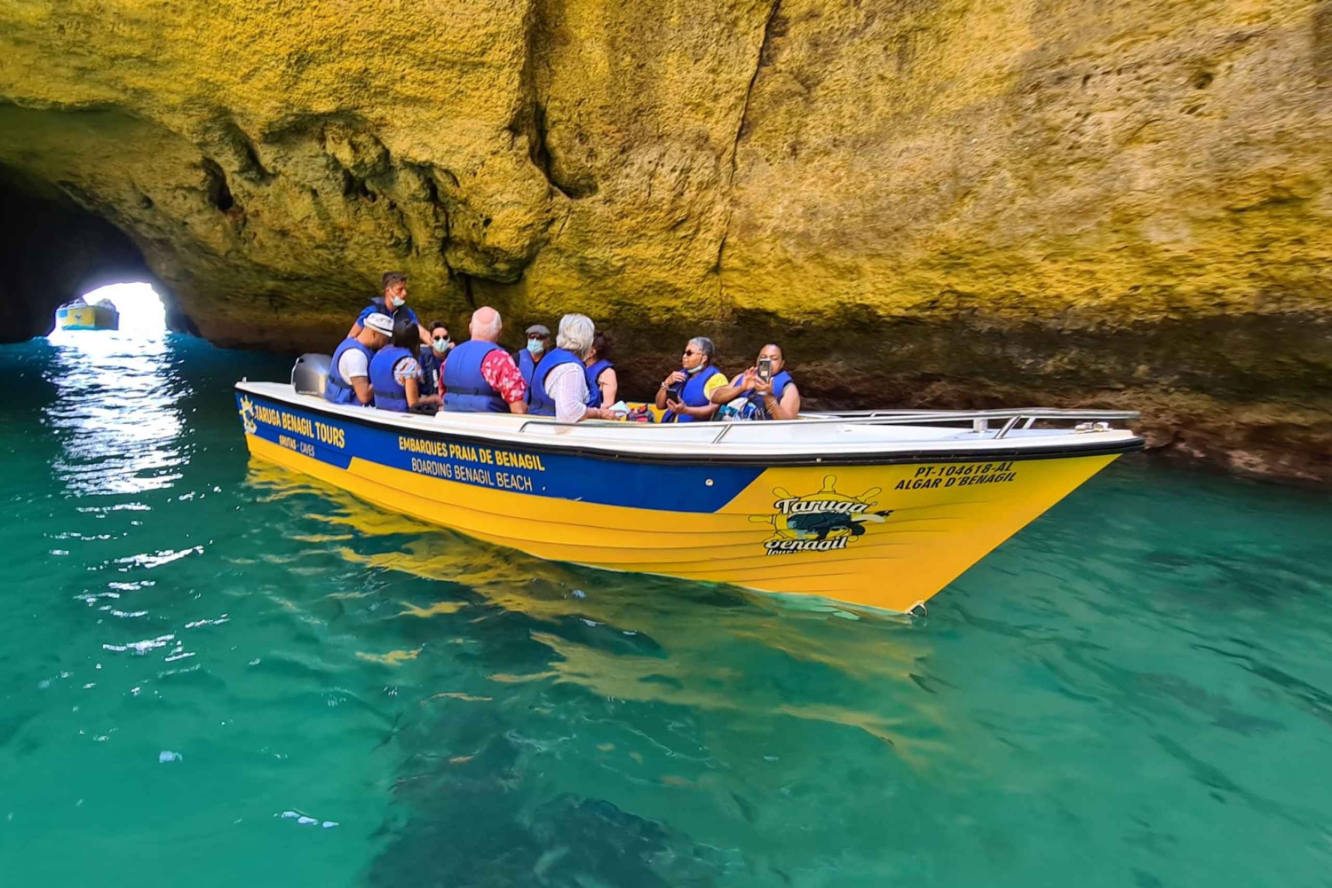 Ontdek de kustlijn van de Algarve tijdens een boottocht vanuit Benagil. Bekijk verschillende grotten bij Carvoeiro en Marinha Beach langs de kust, en bekijk verschillende afgelegen stranden in de omgeving van Benagil.