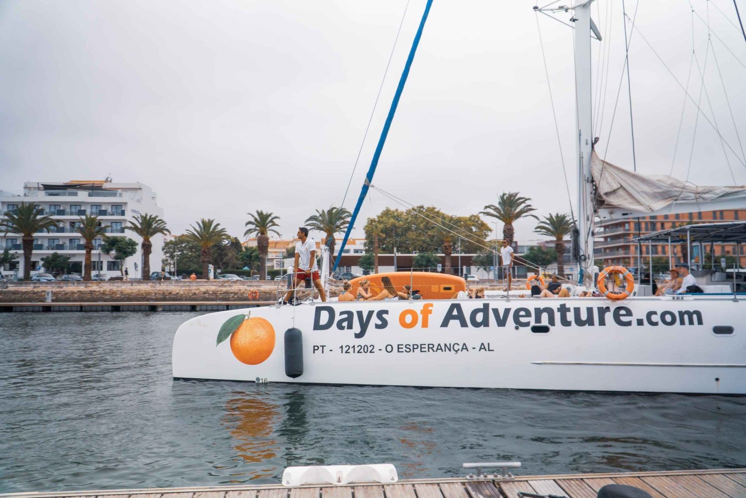 Passeio de catamarã ao longo da Costa Dourada de Lagos com paragens para mergulho com snorkel e paddleboard. Música, bar e redes relaxantes a bordo.