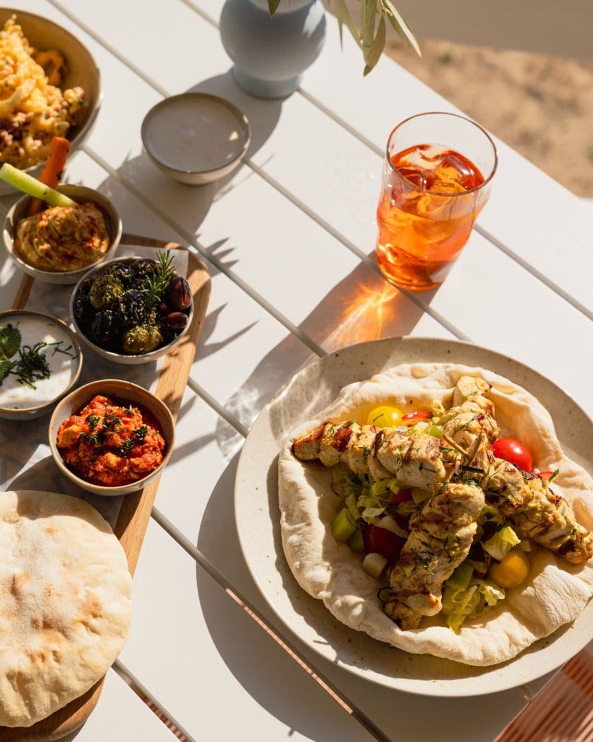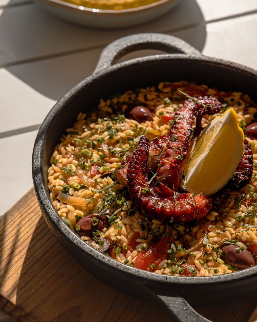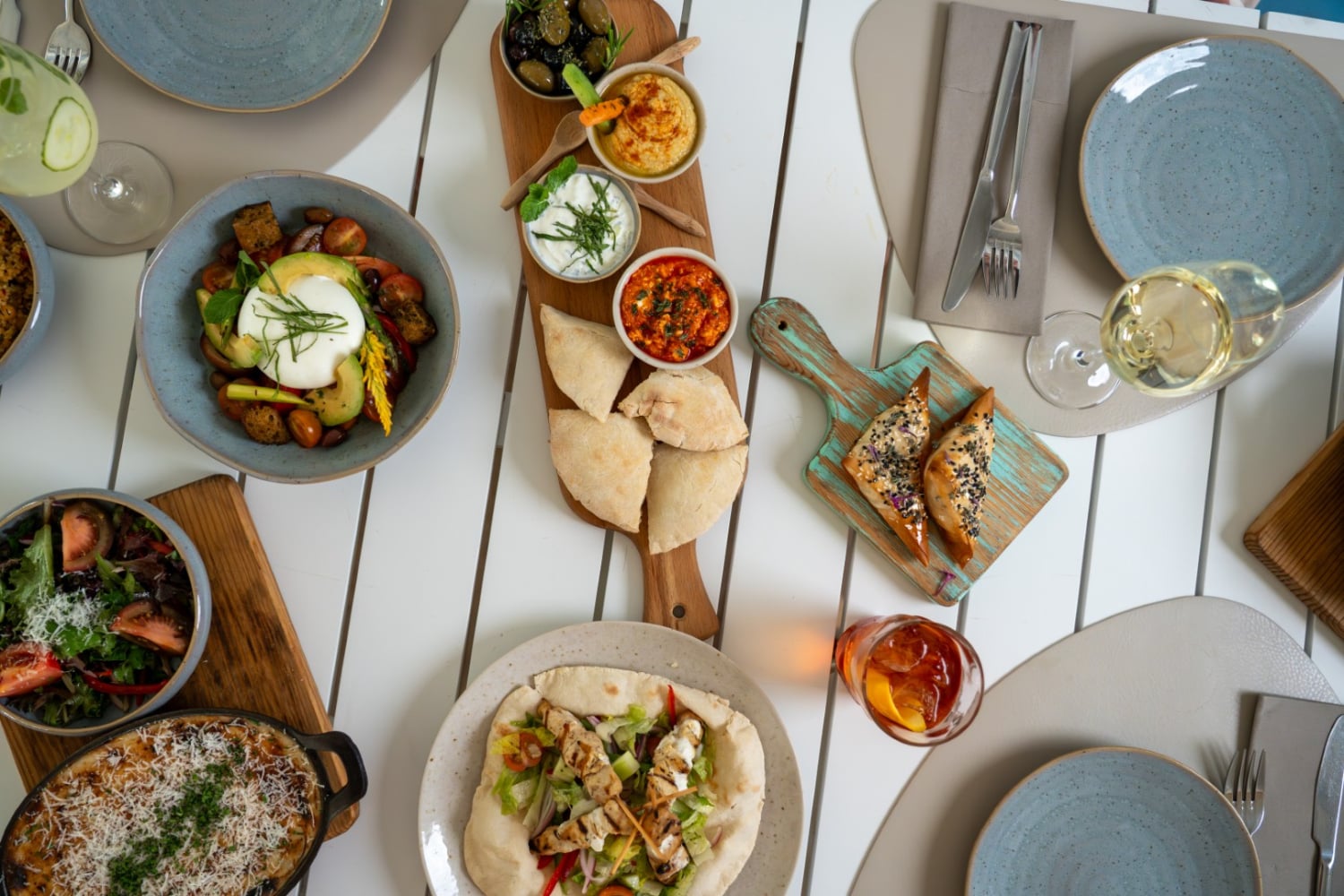 cozinha greco-mediterrânea: deliciosos patês para compartilhar acompanhados de pão pita caseiro da padaria Vila Vita, saladas fabulosas e dolmades. Destaques do menu incluem Orzos (massa em forma de arroz frito com sêmola de trigo) com cordeiro, ou o Moussaka de Carne e Cordeiro com Beringela. Veja o menu completo no anexo.