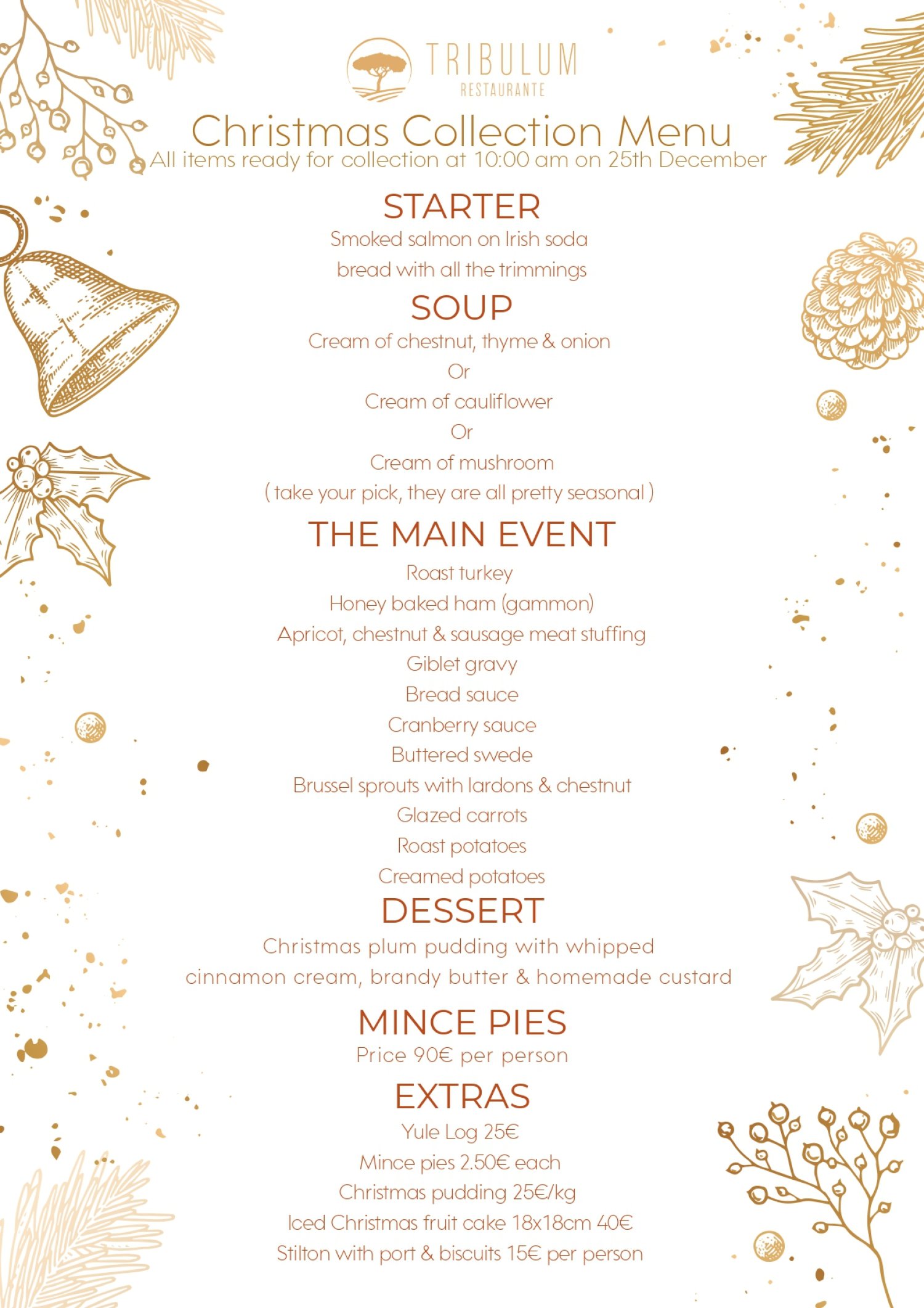 Njut av en storslagen julmeny i bekvämligheten i ditt eget hem på juldagen, tillagad av de fantastiska kockarna på Tribulum. Boka, hämta, njut - det är så enkelt. Förrätter och soppor, kalkon med allt tillbehör, julpudding, mince pies och mer. Julen gjord enkel, av Tribulum @home.